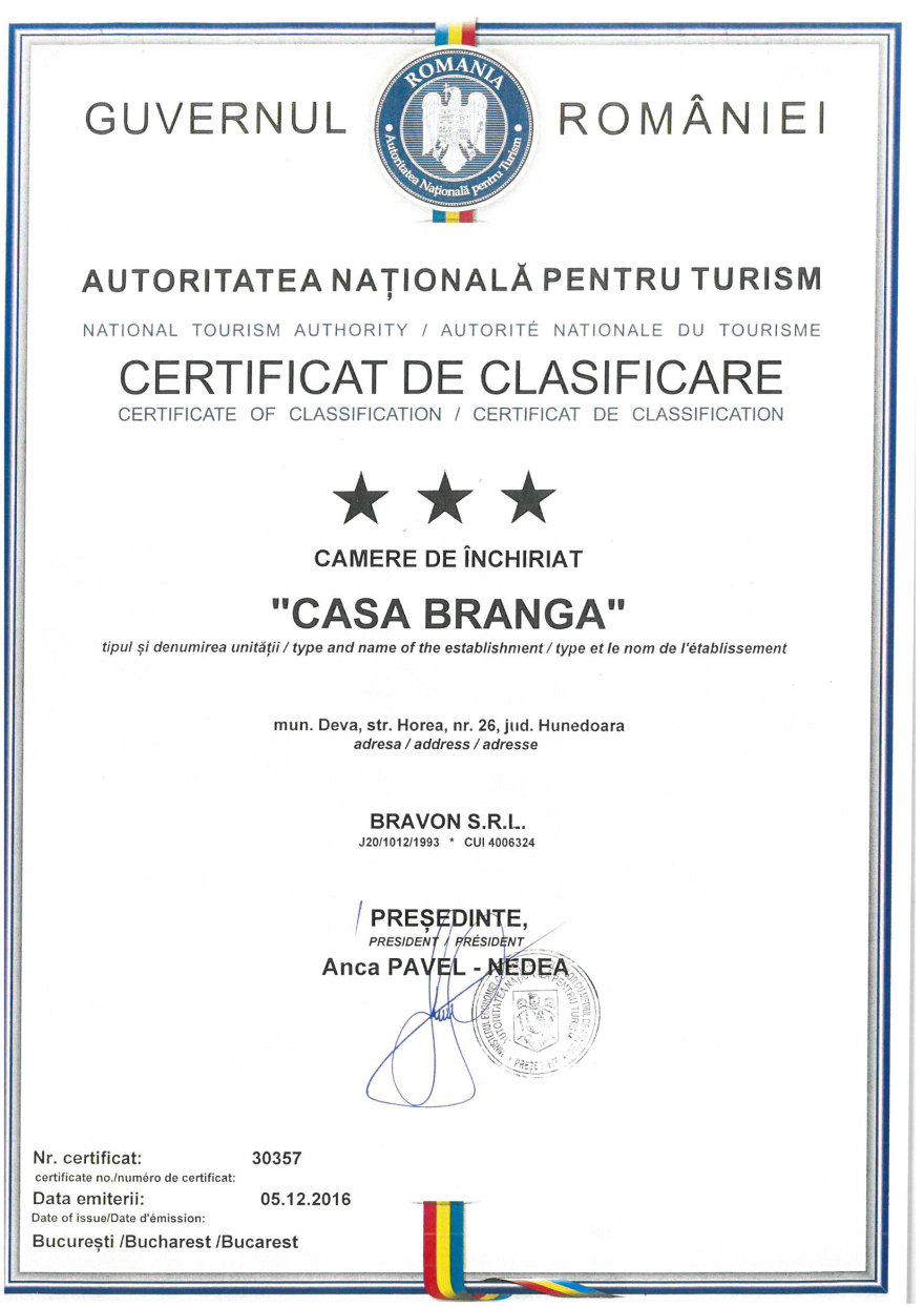 Branga house is centrally located in Deva, str. Horea, nr. 26-100 meters from the cable car going up to the main attraction of the city, fortress Deva. Some of the rooms have views of the Castle property. Downtown pedestrian zone begins in Castle Park area 500 m from the property. Also in nearby 100 m away is the town stadium, the tennis club at the foot of the Citadel and Deva Aqualand water park.